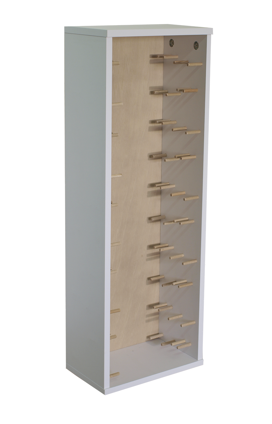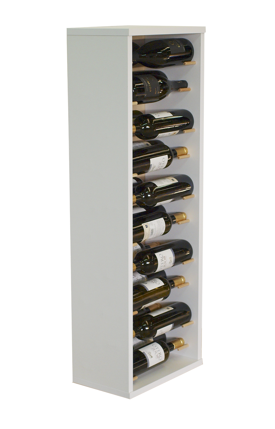 Cada botella reposa de forma segura en horizontal sobre soportes cilíndricos de madera exclusivos, garantizando que el corcho permanezca húmedo y el vino conserve todas sus propiedades durante años. El diseño profundo pero compacto (24 cm de fondo) lo hace ideal para pasillos, cocinas, salones o entradas, sin robar espacio en el suelo.