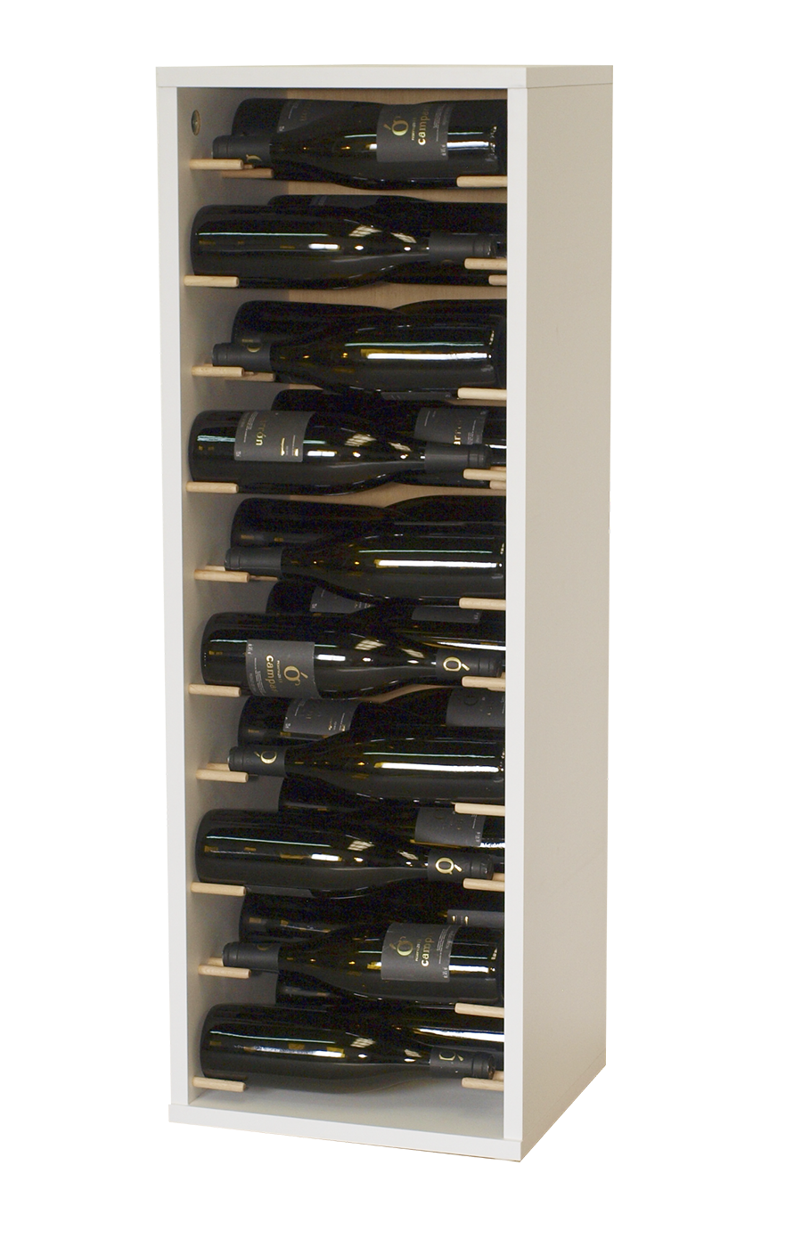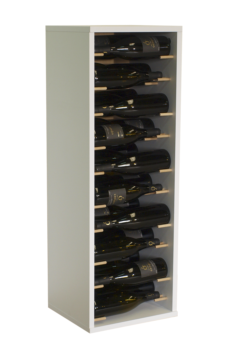 Cada botella reposa de forma segura en horizontal sobre soportes cilíndricos de madera exclusivos, garantizando que el corcho permanezca húmedo y el vino conserve todas sus propiedades durante años. El diseño profundo pero compacto (aprox. 30-32 cm de fondo) lo hace ideal para pasillos, cocinas, salones o entradas, sin robar espacio en el suelo.