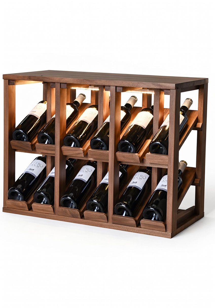 Versión iluminada y ampliada del clásico: dos niveles con 12 botellas en total, luz LED cálida y discreta integrada que resalta etiquetas y crea un ambiente elegante. Lados abiertos para visibilidad 360°, cada botella en su lecho individual extraíble de madera para rotación fácil y conservación horizontal perfecta.