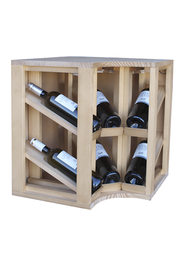 Versión ampliada del EX2195: dos niveles en forma de esquina para aprovechar rincones con 6 botellas en total. Lados abiertos para visibilidad completa, cada botella reposa en su lecho individual de madera para rotación fácil y conservación horizontal óptima.