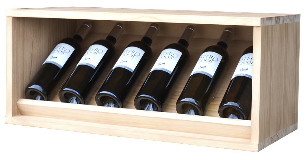 Versión cerrada del EX2191: laterales y fondo cerrados para un look más discreto y protegido, con un soporte único que incorpora hendiduras individuales para cada botella. Mantiene la posición horizontal óptima para conservación del corcho y visibilidad de etiquetas desde el frente.
