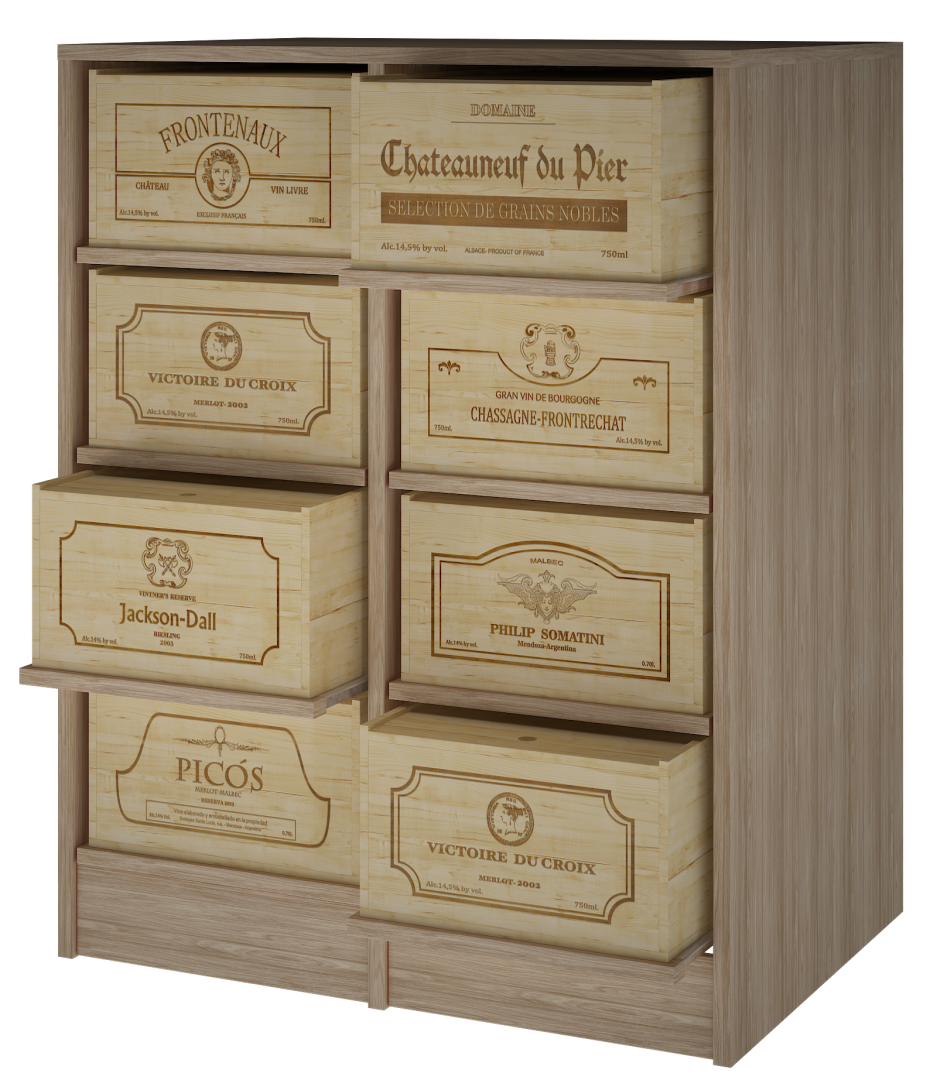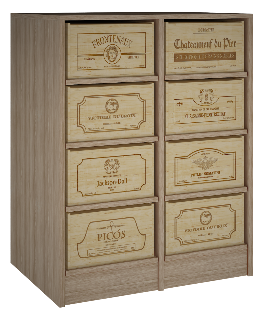 Mueble armario estantería para cajas de vino de madera que combina tradición, estilo con capacidad y fortaleza. Este mueble está fabricado en madera de pino o roble. Las cajas reposan sobre resistentes baldas extraíbles. Está diseñado para soportar hasta 8 cajas de 12 botellas , son cajas rústicas que los coleccionistas suelen tener en casa -el sistema más utilizado en Francia- .Medidas Mueble: Alto 105*82*60. CAJAS de 12 b: Alto 20,50 *35 lado logo* 56 cm