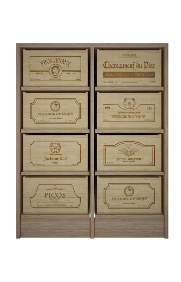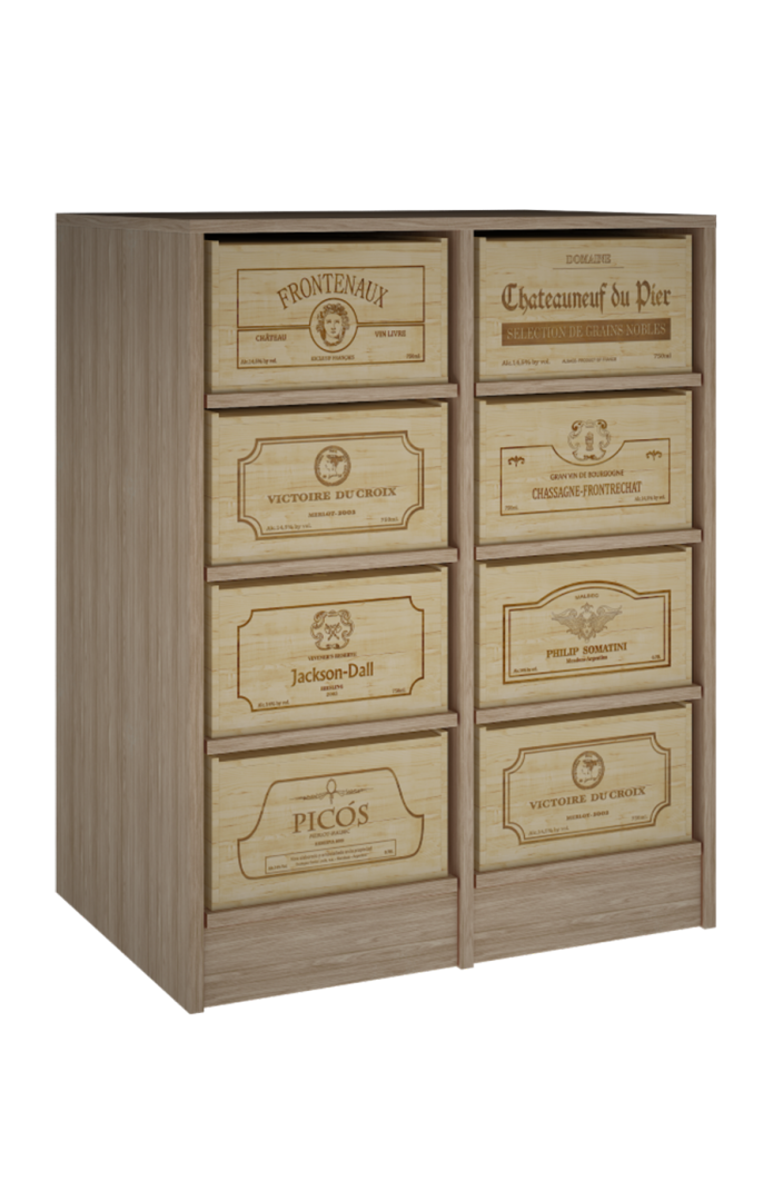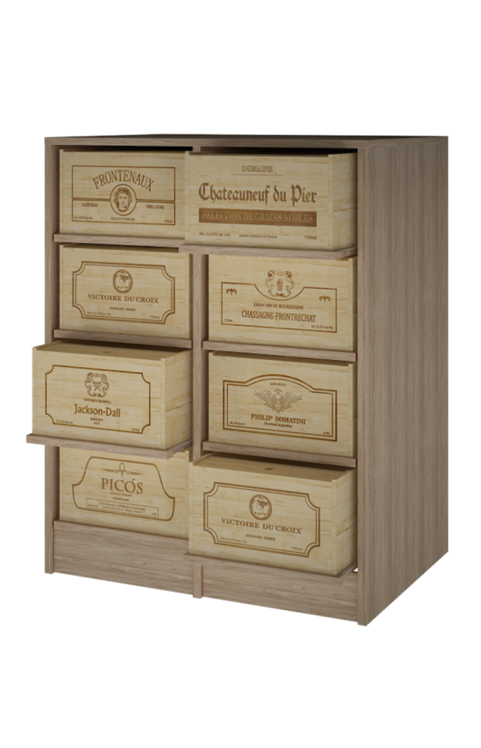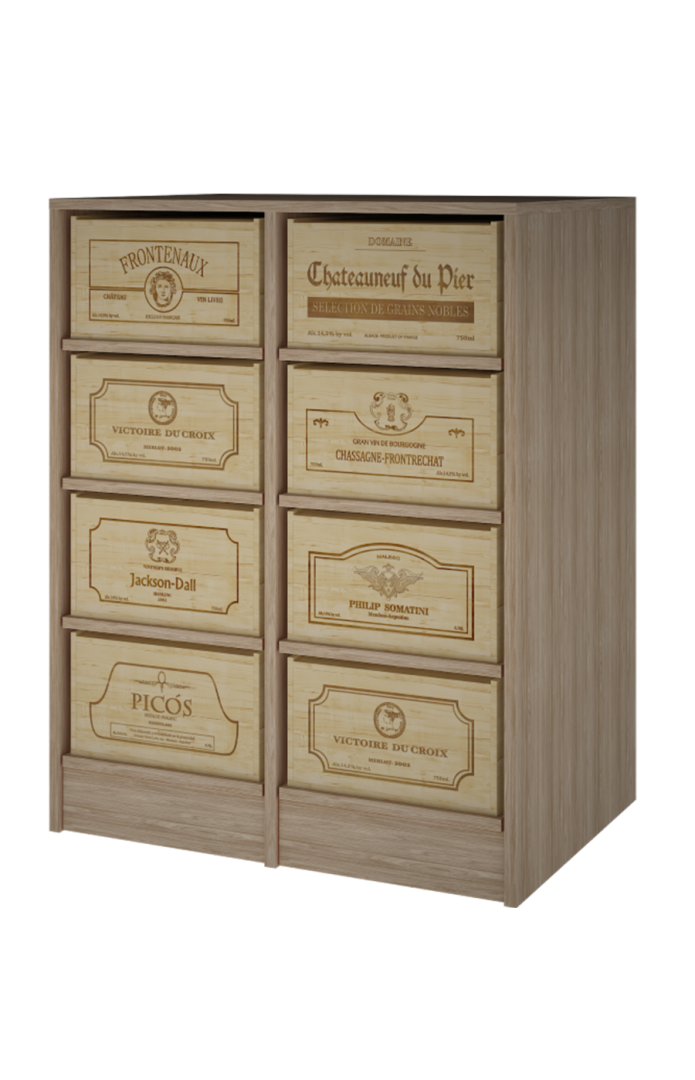 Mueble armario estantería para cajas de vino de madera que combina tradición, estilo con capacidad y fortaleza. Este mueble está fabricado en madera de pino o roble. Las cajas reposan sobre resistentes baldas extraíbles. Está diseñado para soportar hasta 8 cajas de 12 botellas , son cajas rústicas que los coleccionistas suelen tener en casa -el sistema más utilizado en Francia- .Medidas Mueble: Alto 105*82*60. CAJAS de 12 b: Alto 20,50 *35 lado logo* 56 cm