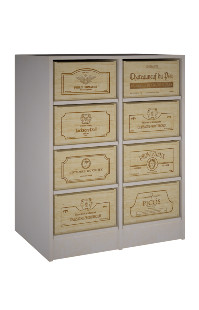 Mueble armario estantería para cajas de vino de madera que combina tradición, estilo con capacidad y fortaleza. Este mueble está fabricado en madera de pino o roble. Las cajas reposan sobre resistentes baldas extraíbles. Está diseñado para soportar hasta 8 cajas de 12 botellas , son cajas rústicas que los coleccionistas suelen tener en casa -el sistema más utilizado en Francia- .Medidas Mueble: Alto 105*82*60. CAJAS de 12 b: Alto 20,50 *35 lado logo* 56 cm