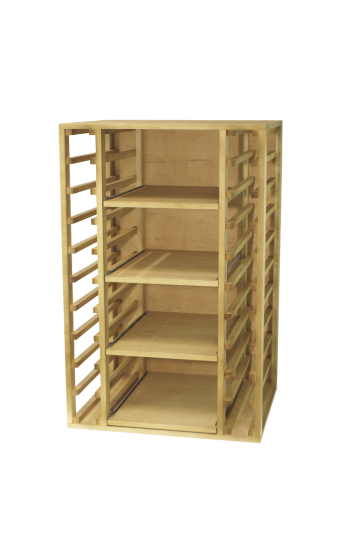 Fabricado con madera de pino o roble, se entrega montado en caja individual. Incluye patas regulables. Incorpora 4 baldas extraíbles para cajas de 12 botellas.