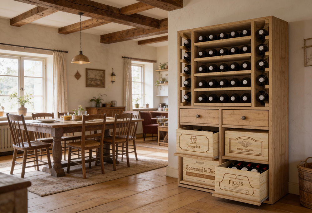Fabricados en madera maciza y con un diseño modular característico de la serie, este pack combina dos de los modelos más versátiles de nuestro catálogo, ideales para bodegas, restaurantes, vinotecas o espacios de exposición.
