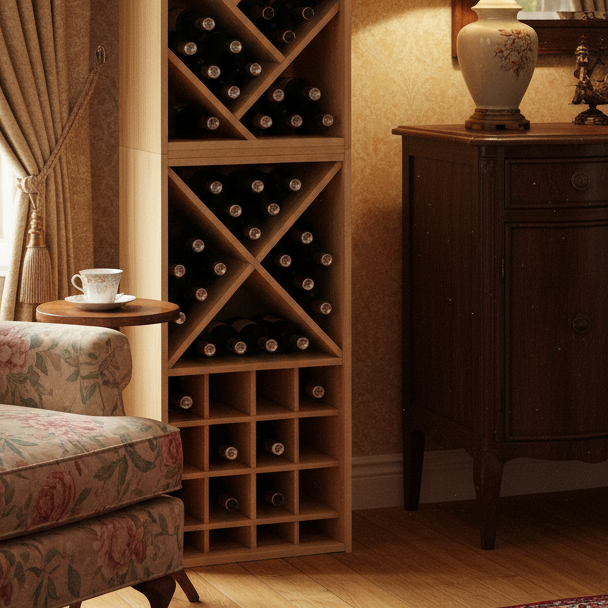 Diseño vertical combinado: parte inferior con 16 huecos individuales para botellas estándar de 75 cl en posición horizontal, y parte superior con aspas en forma de X para almacenar botellas de mayor tamaño (magnum, champagne u otros formatos especiales). Frente y trasera abiertos para óptima circulación del aire y fácil acceso.