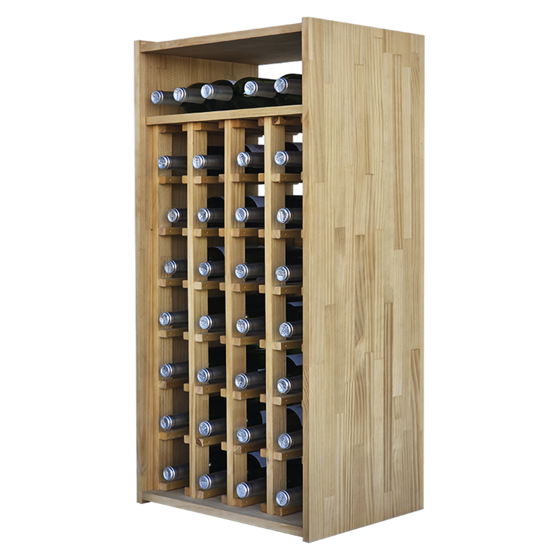 Dispone de 4 columnas independientes formadas por travesaños redondeados de madera que crean huecos individuales, y una estantería superior para 4 botellas  de vino o cava permitiendo almacenar hasta 32 botellas estándar de 75 cl en posición horizontal óptima. Esta disposición mantiene el corcho en contacto con el vino, favoreciendo un envejecimiento perfecto y una conservación optima.