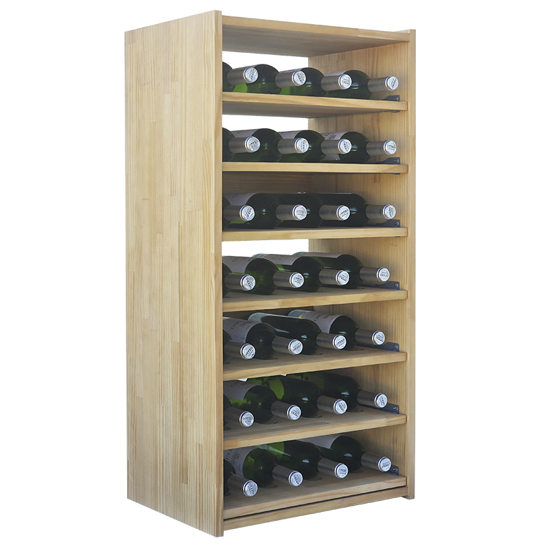 Cuenta con 7 baldas extraíbles montadas sobre guías metálicas resistentes, cada balda diseñada con huecos específicos para alojar 4 botellas estándar de vino o cava (total 28 botellas) en posición horizontal óptima, manteniendo el corcho en contacto con el líquido y favoreciendo un envejecimiento ideal.