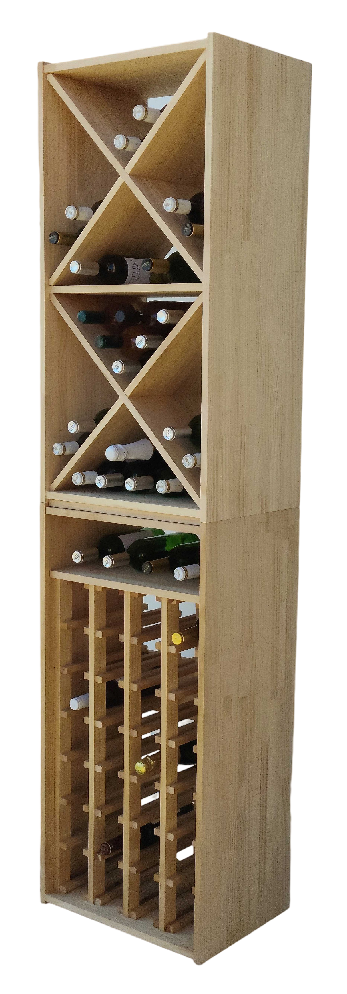 Cada columna cuenta con listones diagonales en forma de X que crean compartimentos individuales inclinados, permitiendo almacenar hasta 80-90 botellas estándar de 75 cl (aproximadamente 40-45 por columna) en posición óptima (cuello hacia abajo), manteniendo el corcho húmedo y favoreciendo el envejecimiento perfecto del vino.