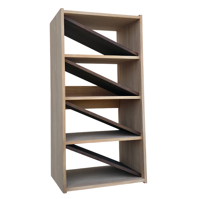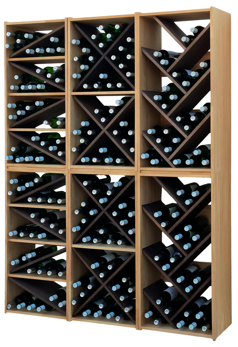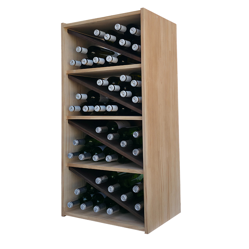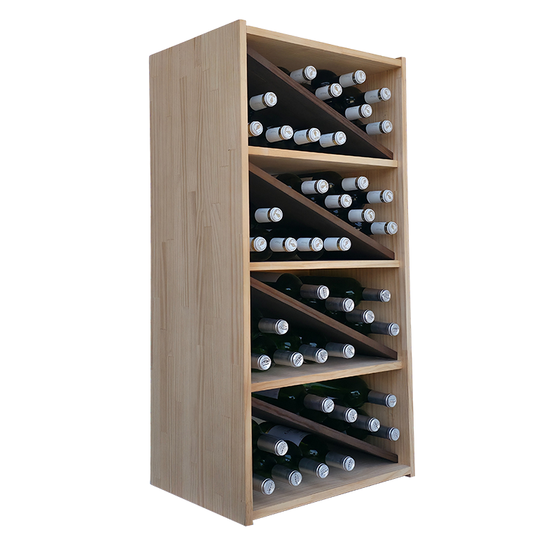 Diseño original baldas en Zig-Zag con cuatro niveles de almacenamiento, ideal para guardar botellas de vino en posición inclinada óptima (cuello hacia abajo), manteniendo el corcho húmedo y favoreciendo un envejecimiento perfecto.