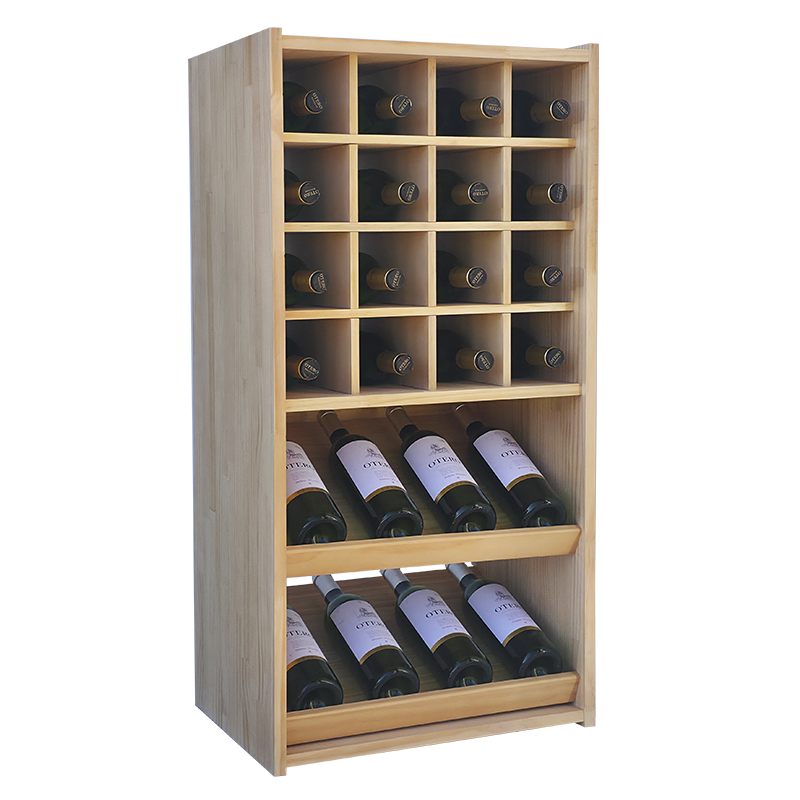 Mueble modular muy práctico fabricado en madera de pino natural con acabado claro que realza la veta, perfecto para combinar almacenamiento seguro con exposición atractiva de tus vinos favoritos.