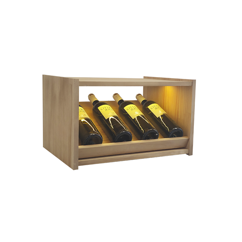 Pequeño botellero fabricado en madera de pino natural con acabado claro que realza la bonita veta, ideal para combinar almacenamiento seguro y exposición atractiva de tus vinos